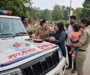 पुलिस की गाड़ी खड़ी थी… बोनट पर एक छोटा सा केक… आसपास खड़े वर्दीधारी जवान और कुछ आम लोग… चेहरे पर मुस्कान, माहौल में अपनापन। पहली नजर में यह एक सामान्य सा जन्मदिन लग सकता था, लेकिन इसकी कहानी असाधारण थी।