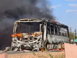आग लगने से बस पूरी तरह जलकर खाक हो गई। सूचना मिलते ही पुलिस टीम मौके पर पहुंची और लोगों को समझाया। अतिरिक्त पुलिस जाब्ता तैनात कर भीड़ को शांत किया।